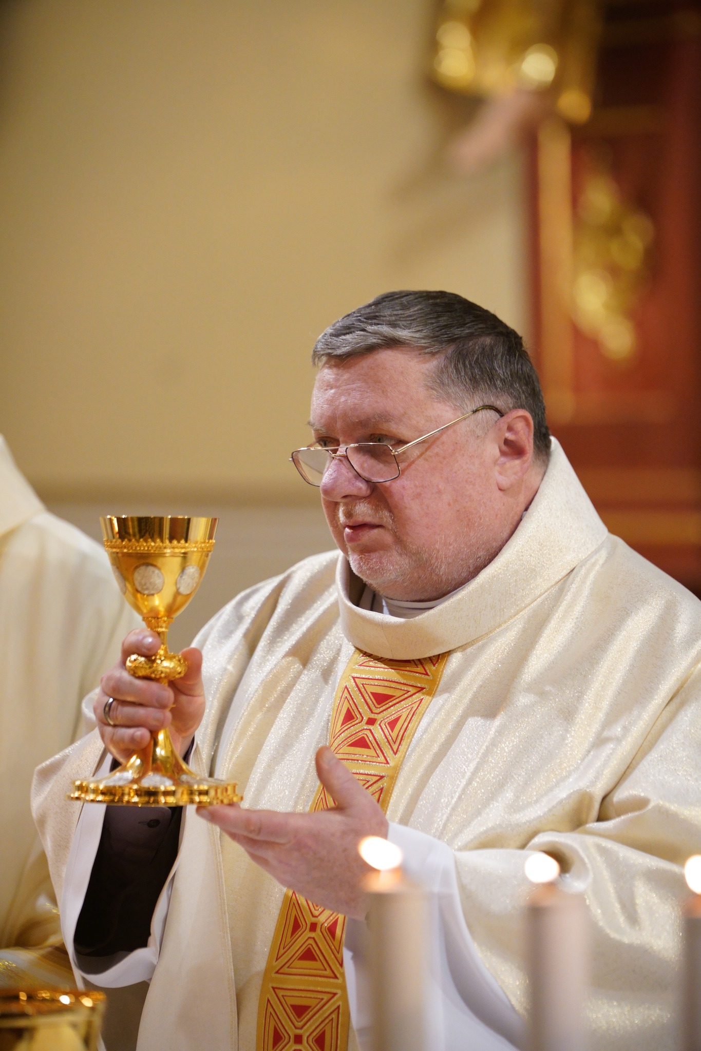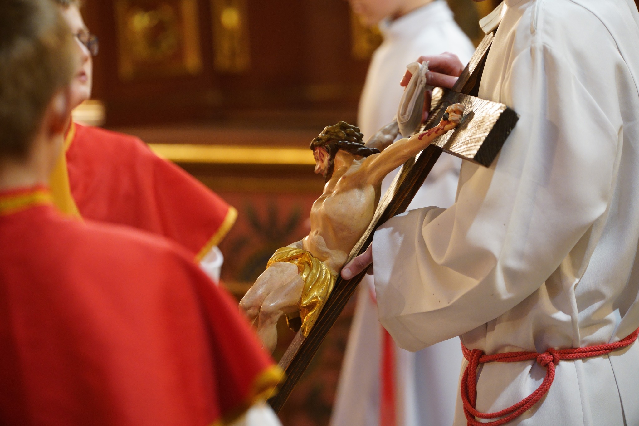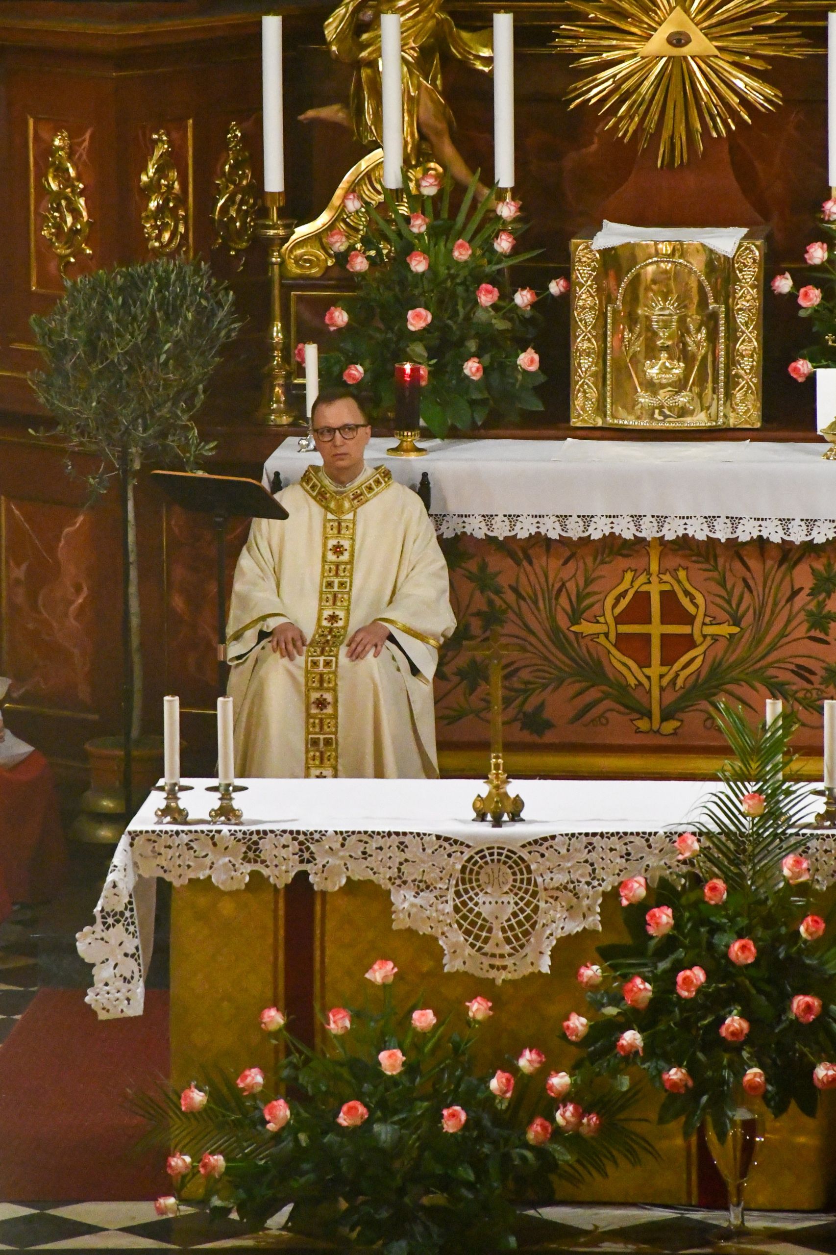Następnie sprawowana była uroczysta Msza Wieczerzy Pańskiej, której przewodniczył o. Lesław Zachura OFM w koncelebrze Ojców posługujących w alwernijskim klasztorze. Na początku Eucharystii przedstawiciele Parafii i Grup Duszpasterskich złożyli obecnym Duszpasterzom życzenia z racji dzisiejszej rocznicy ustanowienia Sakramentu Kapłaństwa. Po modlitwie po Komunii Najświętszy Sakrament został przeniesiony do kaplicy Adoracji, czyli Ciemnicy, przygotowanej tradycyjnie w kaplicy Cudownego Obrazu Pana Jezusa Cierpiącego ,,Ecce Homo”.