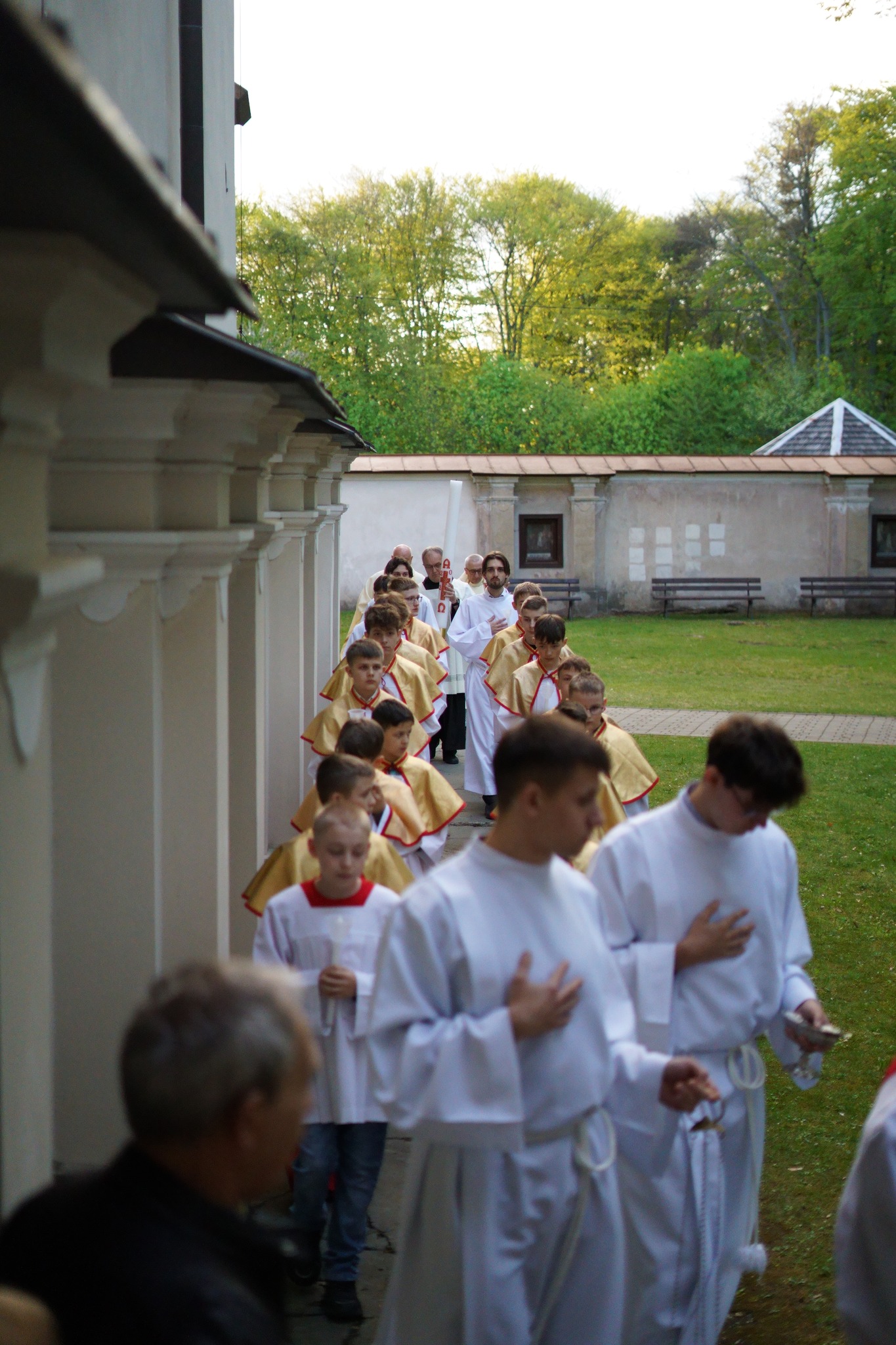 Wigilii Paschalnej przewodniczył wikariusz alwernijskiej Parafii, o. Filip Czub OFM w koncelebrze Ojców tutejszego konwentu. Liturgia rozpoczęła się od obrzędu poświęcenia ognia i przygotowania paschału na Placu Rajskim przed kościołem. Następnie, po procesjonalnym wejściu do świątyni, o. Filip odśpiewał ,,Exsultet” – starożytne orędzie paschalne, przypisywane św. Ambrożemu (w obecnej formie znane od VII wieku). Później odbyła się Liturgia Słowa, w czasie której wybrzmiało radosne ,,Chwała na wysokości Bogu” oraz uroczyste Alleluja. Po Ewangelii pobłogosławiono wodę chrzcielną, odnowiono przyrzeczenia Chrztu oraz obficie pokropiono wiernych. Całość Wigilii dopełniła radosna Liturgia Eucharystyczna, w czasie której sam Chrystus Zmartwychwstały zstąpił ,,z łona Ojca na ołtarz w rękach kapłana”.
